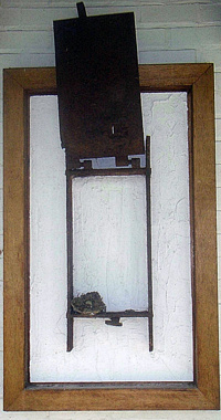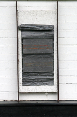 Aber bevor ich dahin komme, werfe ich noch einen Blick zurück entlang dem Pfad, entlang der ewig langen Blumenreihe, entlang dem Haus. Die letzten Fachungen bestehen wieder aus Klinker und sind somit tragfähig: Zwei Objekte hängen hier, zwei unterschiedliche Themen: Öffentlicher Brief ist der typisch weiße Malgrund mit rauer Oberfläche, eingefasst von zwei breiten Flacheisen. Auf dem Weiß ausgerollt ein Bleiband fast über die komplette Breite. Darauf wiederum zwei übereinander angebrachte rechteckige Marmorplatten, in deren Zentrum je eine breite verwitterte Rostspur. Von allen Linien und Flächen bleibt letztlich nur diese Spur übrig, zieht den Blick auf sich, auch wenn diese Reste nur noch rudimentär vorhanden sind. Der Brief muß vor ewig langer Zeit verfasst worden sein.