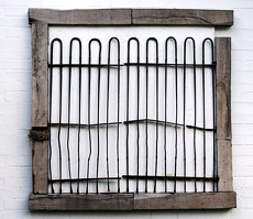 Gleich um die Hausecke hängt Nestbild 6 und wieder ist das titelgebende Element verschwindend unscheinbar in einem sehr robusten Zusammenhang: Der nun schon bekannte weiße Grund ist diesmal von einem mehrteiligen, schrundigen, unebenen, ungehobelten und zudem ungeschlossenen Rahmen umgeben. Den Eindruck des ungehobelten setzt das fort, was darauf platziert ist: Teile eines Gitters, das man aus Tierställen kennt. So dünn und vermutlich nicht nur von der Zeit angenagt die Stäbe sind, muß dieses Gitter von einigem Alter sein. Auffallend die Rauheit des gesamten Objektes. Fast meint man noch den Geruch von Stall aufzunehmen. Und in all der Rohheit wieder ein fein ziseliertes Nest. Hier ist es eindeutig gesetzt, denn welcher Vogel unterzöge sich der Mühe, den Nachwuchs zwischen zwei sehr eng aufeinanderliegenden Balken aufzuziehen? Andererseits: wer weiß?